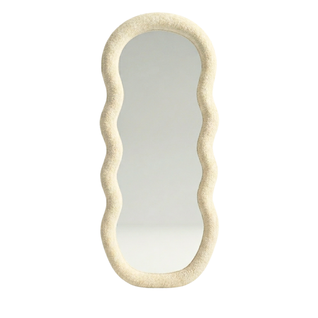 Le Miroir Bulle séduit par son design ondulé et irrégulier, inspiré des formes douces et organiques. Son cadre en tissu bouclette